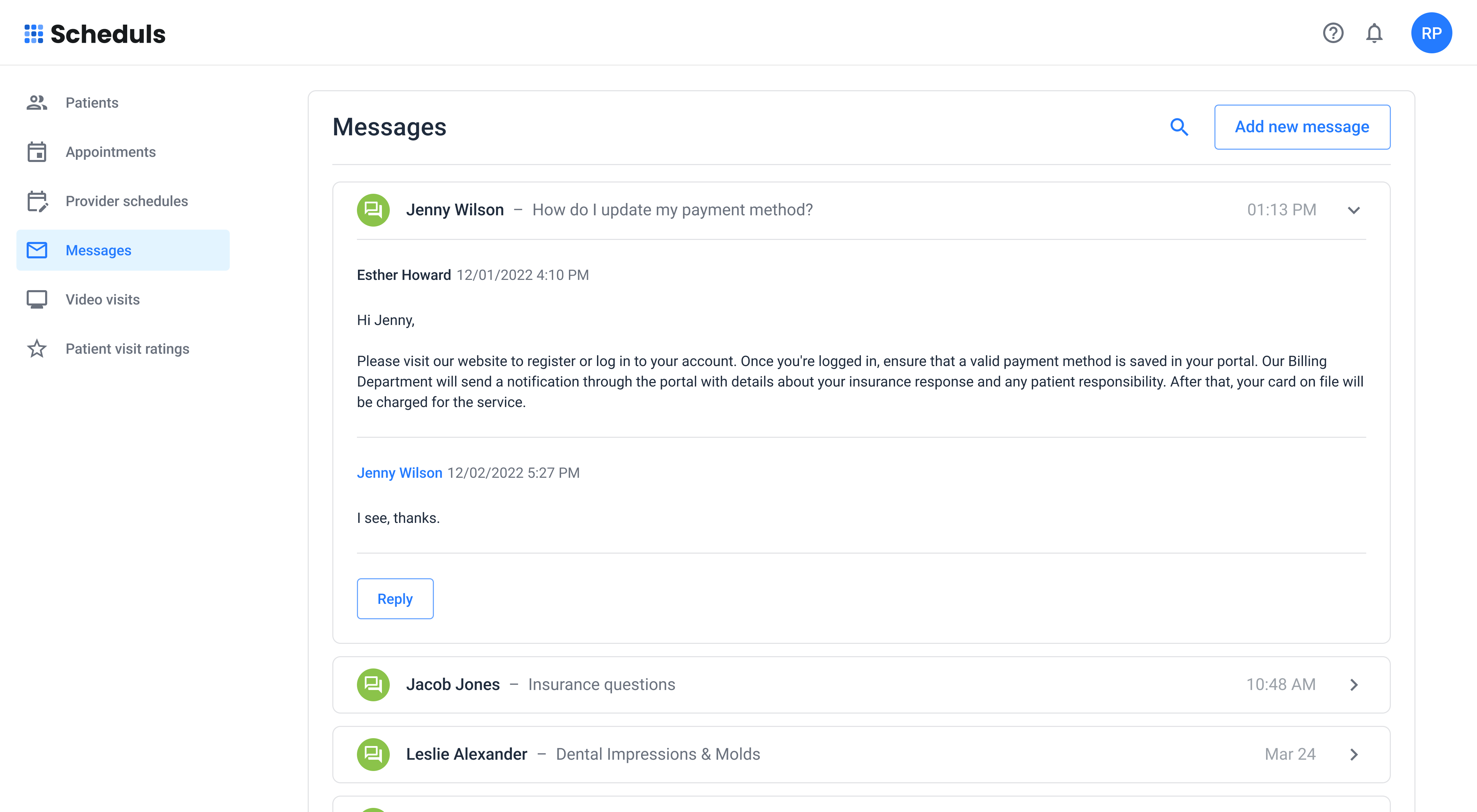 Scheduls offers a robust in-portal messaging system, allowing for secure and private conversations between patients and healthcare providers.